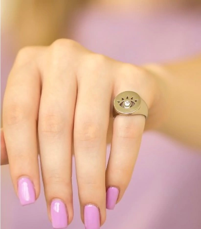 O famoso anel de dedo mindinho! Gravado com um olho grego, cravejado ao centro com uma zircônia, disponível nos banhos ouro e prata, possui 16mm de diâmetro interno (equivale ao tamanho 14 de anel). Para quem tem as mãos mais magrinhas ele também fica perfeito no dedo anelar, ou até mesmo no indicador.