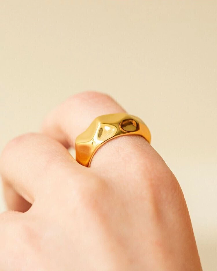 Anel orgânico em acabamento ouro ou prata. Os modelos de textura irregular são sofisticados e podem adicionar um toque de sofisticação e glamour aos seus looks. O conjunto Surya é cuidadosamente trabalhado para realçar a textura orgânica, criando um contraste visualmente atraente.