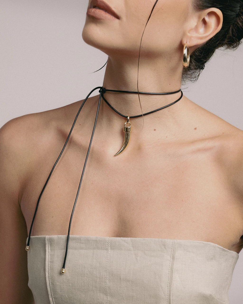 1,10m de fio encerado nas cores preto e café, ajustável em diversas alturas diferentes, pra poder acompanhar o decote que estiver usando. Possui ponteiras em banho ouro, bem como o pingente, modelo dente de sabre, boho e autêntico, pra fechar com chave de ouro essa peça que é a sua cara!